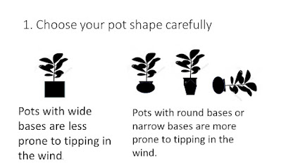 Inexpensive coat hangers from a big box hardware store make good hooks to go over the rims of plant pots. We use four hook per pot with wire, which then is attached by a bolt to the tree stump the pot is sitting on. If the pot is nestled inside shrubby grown covers like cottoneater or junipers, another hook can be use to tie down the pot to the branches of the ground cover.